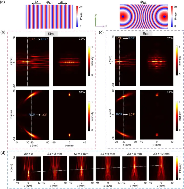 平面拼接:通過對兩個模塊進(jìn)行平面拼接,可實現(xiàn)整體相位分布的重新構(gòu)建,其對應(yīng)的相位分布如圖3(a)所示。仿真與實驗結(jié)果[圖3(b)(c)]均表明,該拼接結(jié)構(gòu)能夠穩(wěn)定實現(xiàn)預(yù)期的雙焦點與無衍射波束生成功能。更進(jìn)一步,拼接結(jié)構(gòu)允許模塊之間的相對位置進(jìn)行靈活調(diào)節(jié)。圖3(d)所示的仿真結(jié)果表明,當(dāng)模塊在面內(nèi)平移約10 mm 時,光束的聚焦位置可在 z = 30–50 mm 范圍內(nèi)連續(xù)變化。這一特性為變焦成像等應(yīng)用提供了新的實現(xiàn)方式。