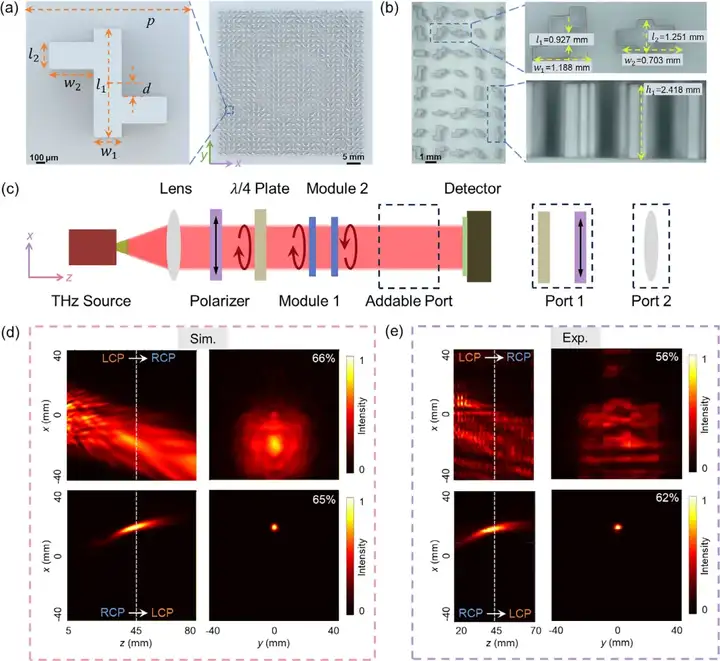 超表面設(shè)計、制備與表征:如圖2(a)所示,研究中選取了一種具有多自由度幾何參數(shù)的“Z"形手性晶胞。通過調(diào)節(jié)晶胞的多個幾何參數(shù),可以在較寬范圍內(nèi)獨立調(diào)控左右旋圓偏振光的透射相位與效率。基于全波電磁仿真,對不同參數(shù)組合下的相位延遲和透射效率進(jìn)行了系統(tǒng)掃描,構(gòu)建了完整的晶胞數(shù)據(jù)庫。通過合理排布不同手性晶胞,可實現(xiàn)復(fù)雜的太赫茲波前調(diào)控功能。研究團(tuán)隊采用摩方精密面投影微立體光刻(PμSL)3D打印技術(shù)(nanoArch® S140,精度10 μm)制造了兩個相同的超表面模塊。所選用的材料為氧化鋁陶瓷,該材料在太赫茲頻段具有較高折射率和良好的介電性能,同時兼容高精度3D打印工藝。圖2(b)展示了制備完成的超表面模塊的顯微結(jié)構(gòu)照片及典型晶胞的尺寸測量結(jié)果。隨后,利用連續(xù)太赫茲波測量系統(tǒng)[圖2(c)]對器件性能進(jìn)行了系統(tǒng)表征。實驗測得的聚焦位置、偏轉(zhuǎn)角度及場分布[圖2(e)]與仿真結(jié)果[圖2(d)]高度一致,驗證了設(shè)計方法與制造工藝的可靠性。