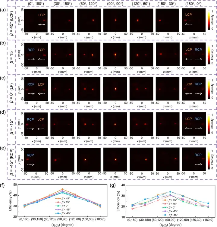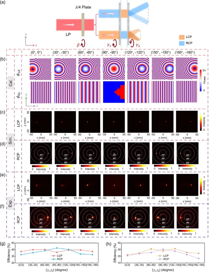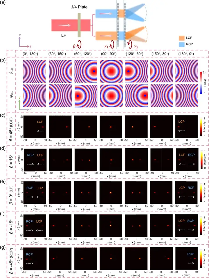 反向級聯(lián):在反向級聯(lián)配置中,系統(tǒng)能夠在近場聚焦與遠(yuǎn)場定向傳輸模式之間實現(xiàn)切換。如圖6所示,在近場模式下,聚焦點可在 ?20 至 19 mm 范圍內(nèi)連續(xù)掃描(焦距f ≈ 23 mm);而在遠(yuǎn)場模式下,出射波束可在約?40° 至 42° 的視場角范圍內(nèi)實現(xiàn)定向傳輸。